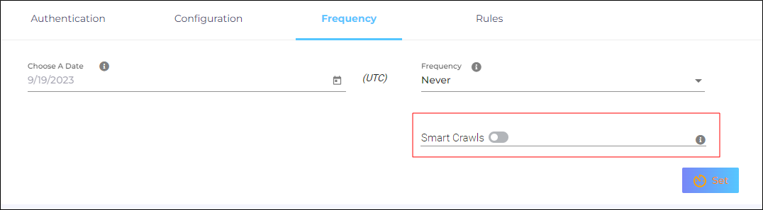 The first crawl is always performed manually after configuring the content source. In the Choose a Date field, select a date to start the crawl; only data created after the selected date will be crawled*. For now, leave the frequency set to its default value, Never, and click Set.