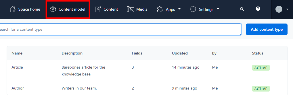 After setting the connection and configuring frequency, define content models for indexing. You can find a list of all content models on the Content model page. In the image, you can see two content models: Article and Author.