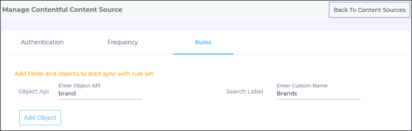 In Rules, enter a content model in Object Api and give it a name Search Label. If the name of the Content model is correct, click Add Object. To add more than one Content models, repeat the process.