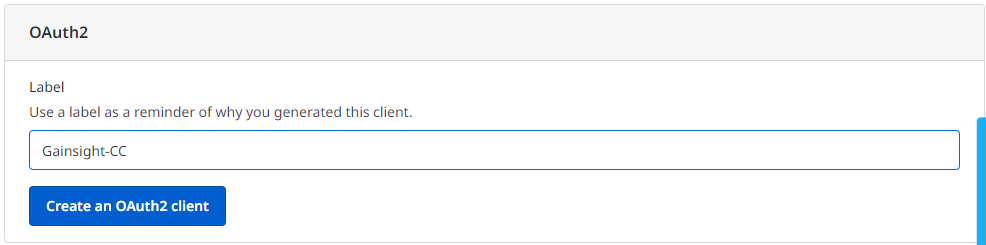 To get the Client ID and Client Secret, create an OAuth2 client. To do this, add a name in the Label field and click Create an OAuth2 Client