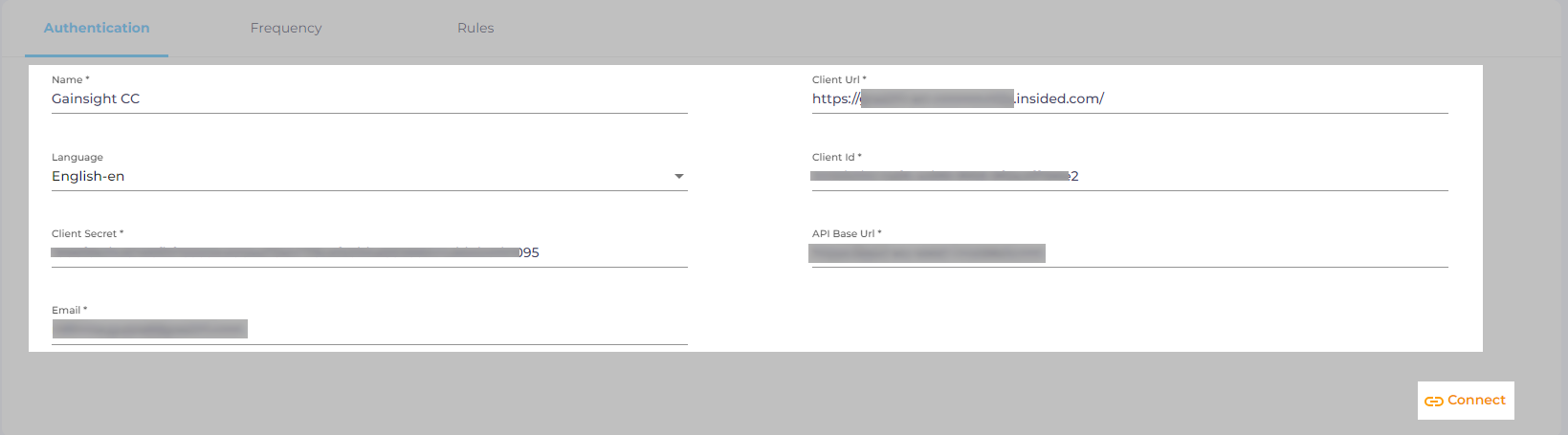 Client ID. For instructions on obtaining your Client ID, refer to the documentation Obtain Client ID, Client Secret, and API Base URL for Authenticating Gainsight Customer Communities.