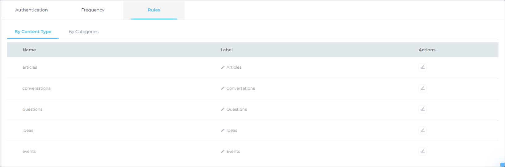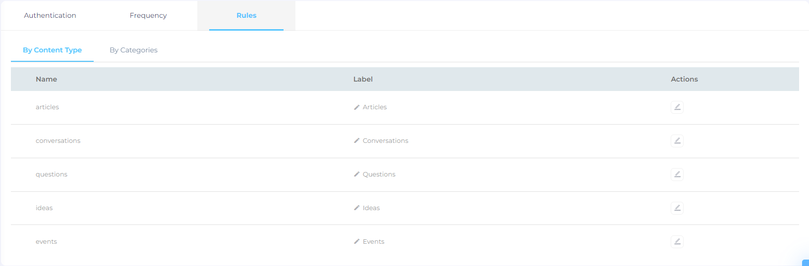 There are five objects in Rules > By Content Type: Articles, Conversations, Questions, Ideas, and Events.