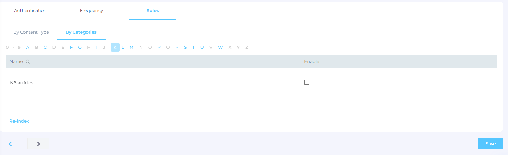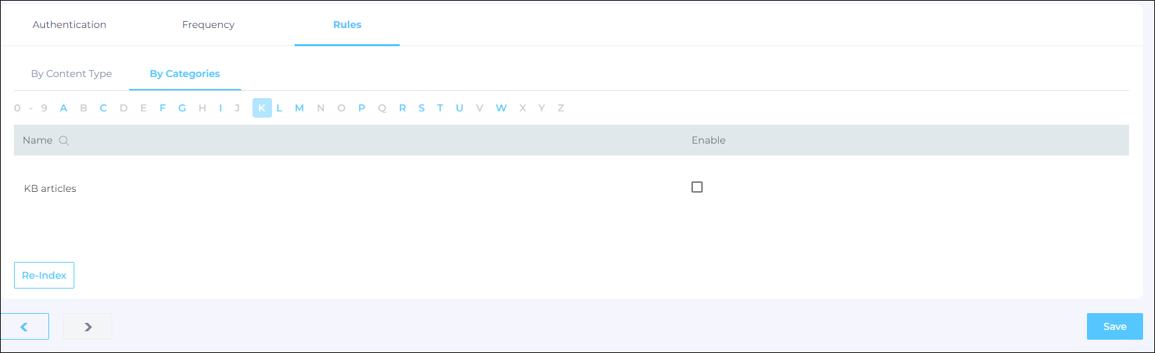 Switch to By Categories. Use the alphabetical index to find categories. The letters highlighted in blue indicate a category. For example, KB articles is shown under the letter K. Use the checkbox to select the categories for indexing and click Save.