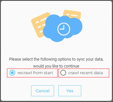 Recrawl from start deletes the entire index for the object. All the data in the object is crawled from the start date mentioned in the Frequency tab. Then, a new index is created.