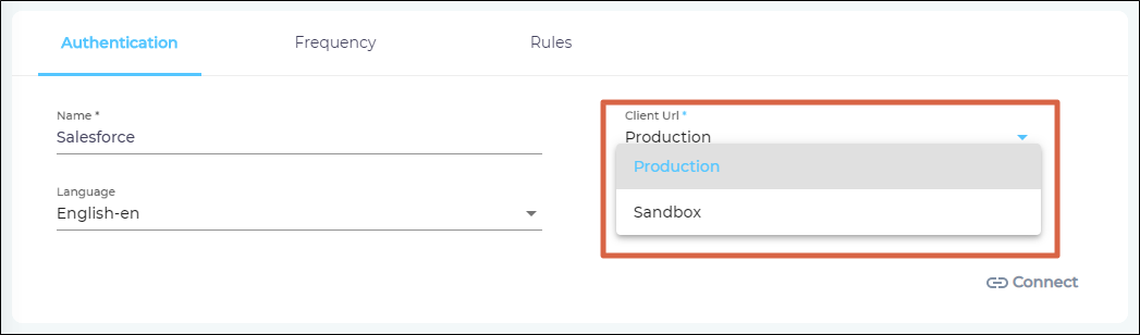 - Select Sandbox or Production in Client URL. Your selection will decide if SearchUnify indexes the data from your sandbox or production instance.
