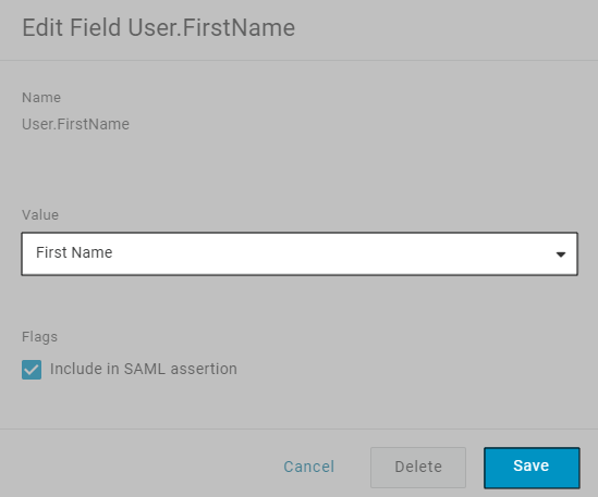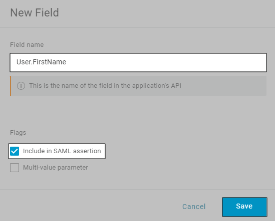 8. Enter User.FirstName in Field Name. Check Include in SAML assertion and click Save.