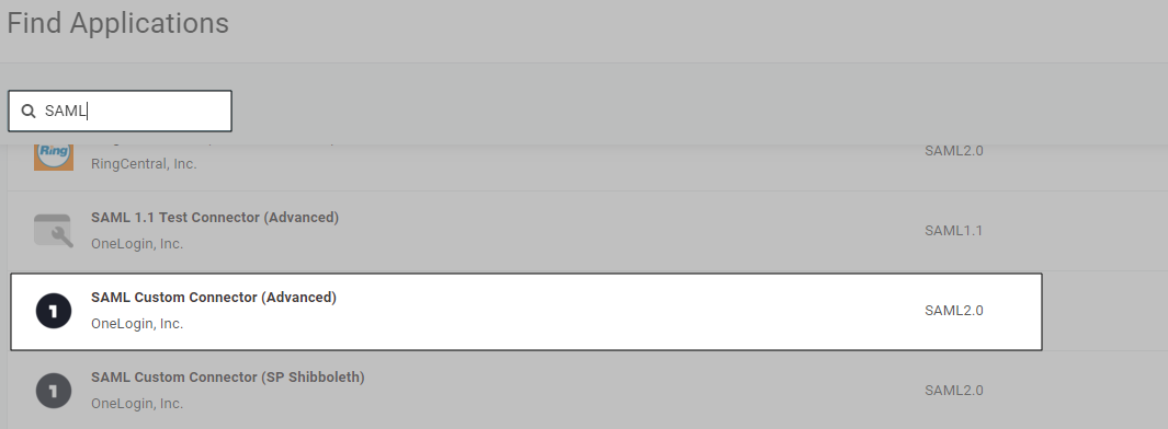 3. Search [saml], and open SAML custom connector (Advanced) from the search results.