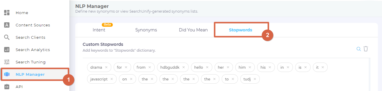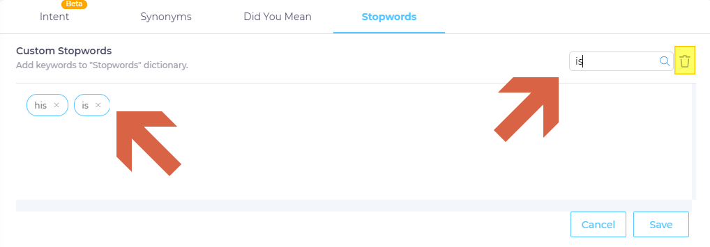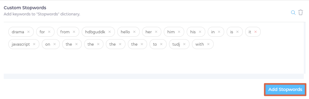- If your instance contains a large number of stopwords, you can utilize the search bar to locate a specific stopword and then click