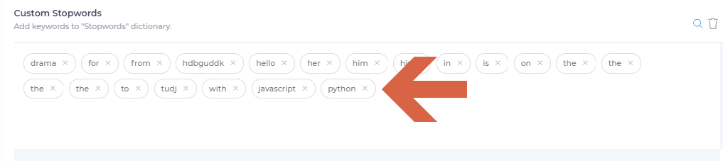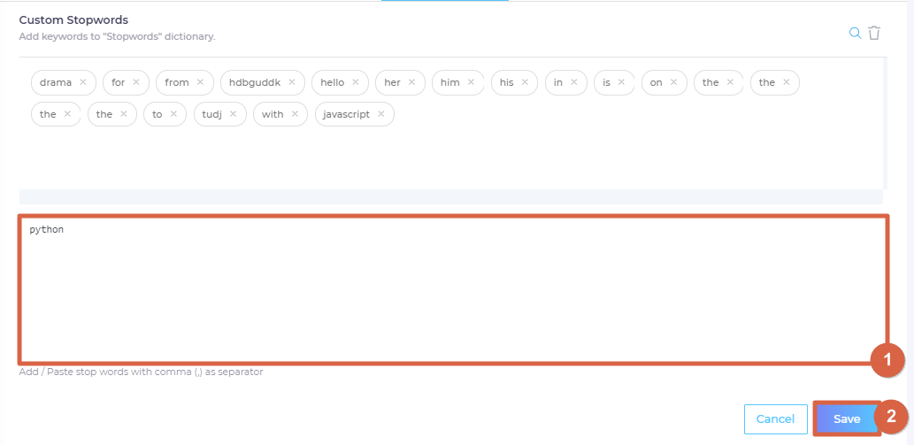 In the text box, enter your stopwords separated by commas. Don't add spaces after the commas if you're adding multiple stopwords. The correct format is 'python,java,golang'. The incorrect format is 'python, java, golang.' Once you've entered your stopwords, click the Save button.