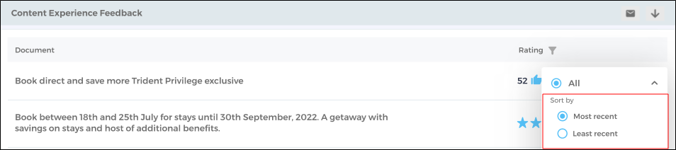 The report prioritizes articles with the most recent feedback. You can change this default order by selecting Sort By > Least Recent under the Rating filter.