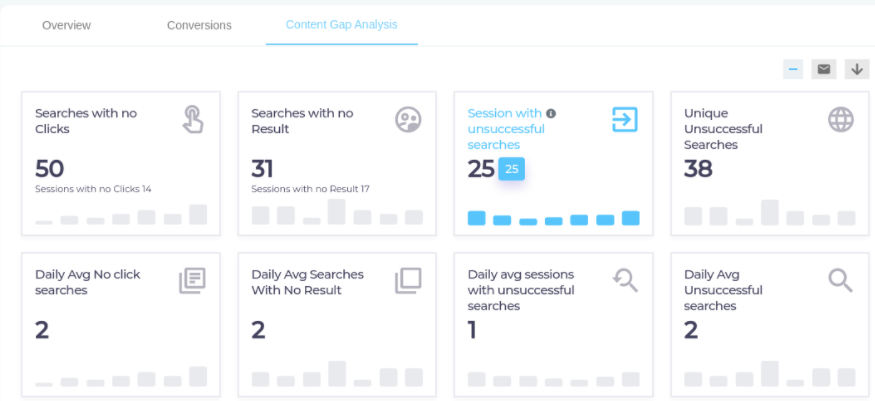 - Unsuccessful Searches. This graph shows searches with no results and no clicks in a selected time period. Helps to track keywords that do not generate any search result.