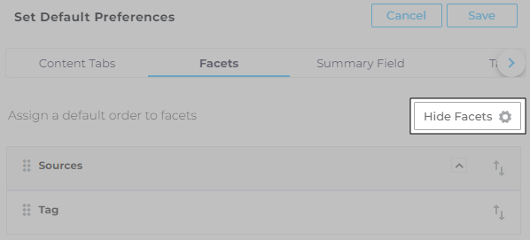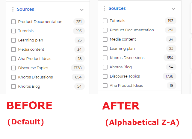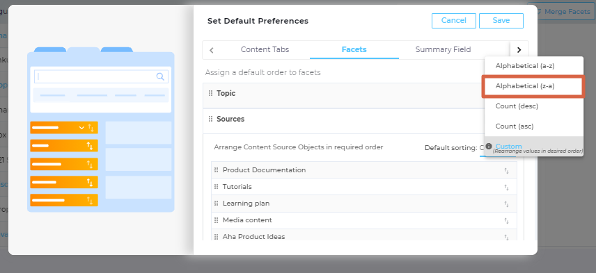 - Select an arrangement from the dropdown: Alphabetical (A-Z), Alphabetical (Z-A), Count (Ascending), Count (Descending), and Custom. Except for Custom, which requires instance users to drag facet values, all sortings are automatical. For example, if 5 facet values are returned for a query and the chosen arrangement is Alphabetical (Z-A), then those 5 facet values will be arranged in the reverse alphabetical order in Sources.