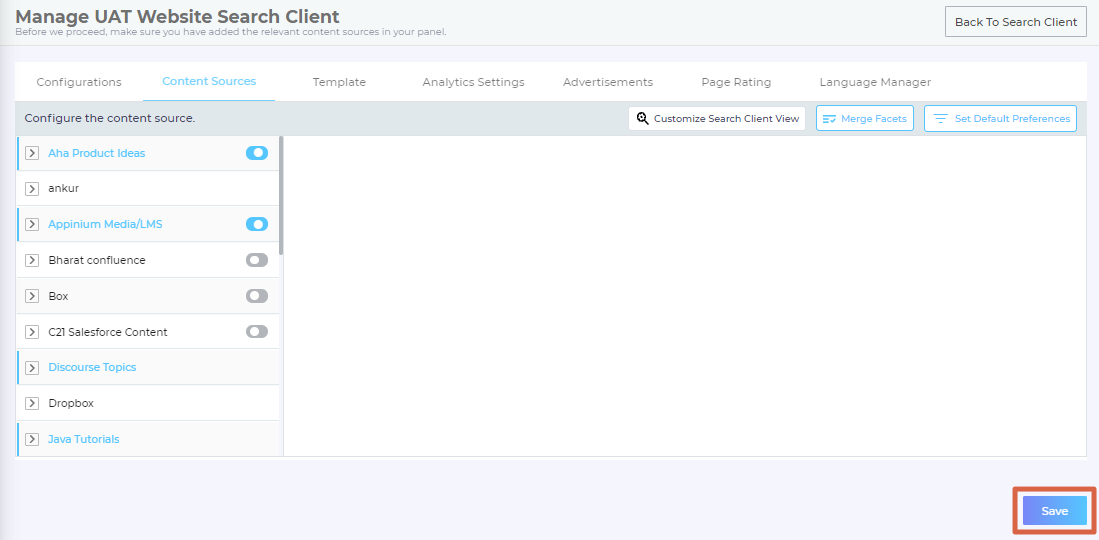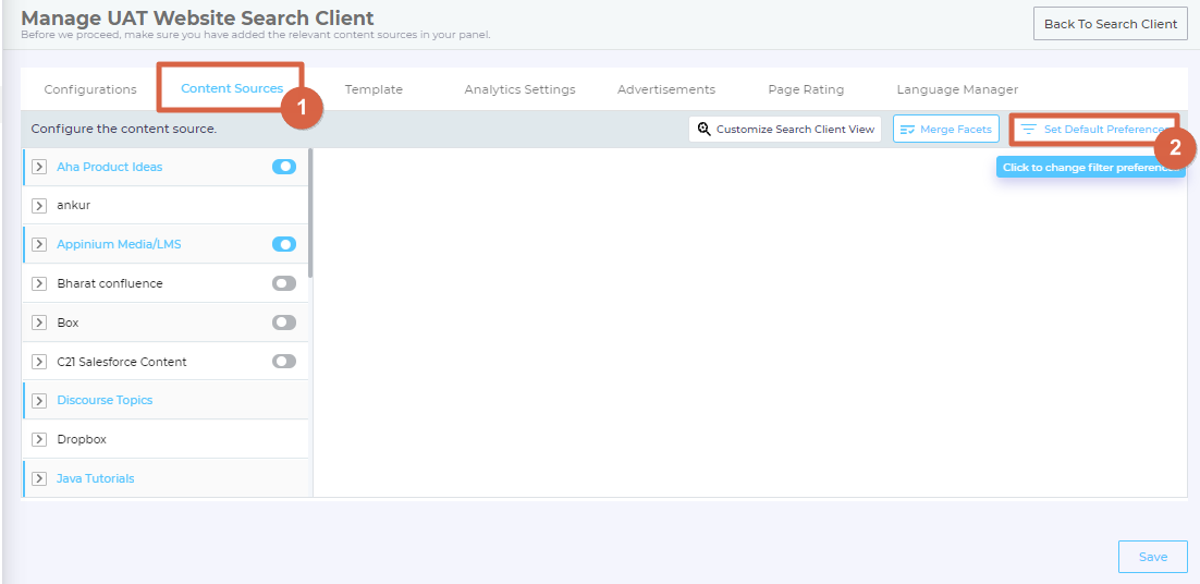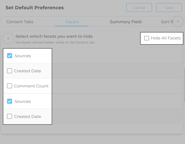 Check the facets that should disappear from the search client. Alternatively, you can check Hide All Facets to remove them all. When a search user in on the All Content tab, he sees only the facets that haven't been hidden. On jumping to a content source tab on a search client, the user sees the facets only for the selected content source.