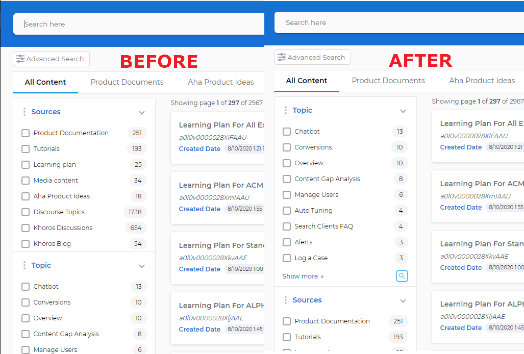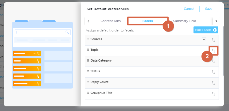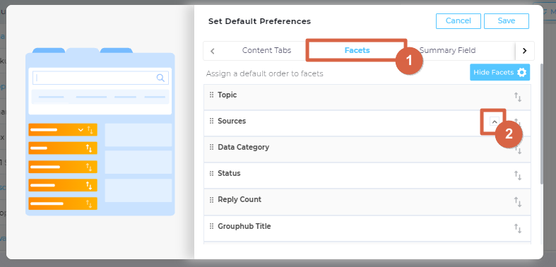 Facets on a search client can be rearranged to improve search experience. For instance, Sources and Authors can swap places and Community: Category can be placed ahead of both of them.