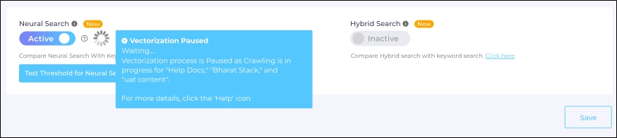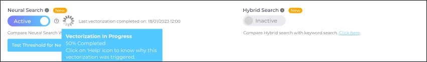 Vectorization takes place each time one of the mentioned scenarios takes place. When search client or content source settings are updated during vectorization then the already-running process stops and vectorization starts anew. You will see a loader when vectorization is in process. Upon completion, you will see the last vectorization date.