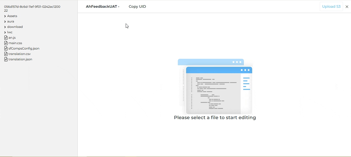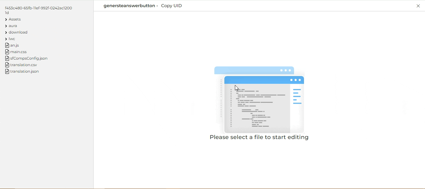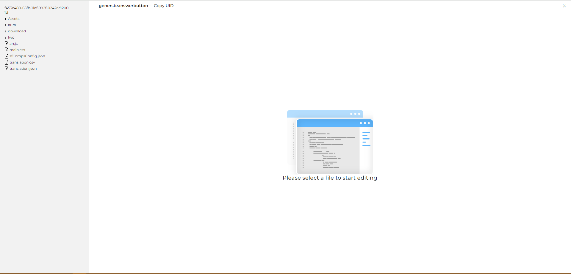 To start, select a component file for customization. You can create new LWC components or edit the existing ones. You can ignore the files of the Aura components.