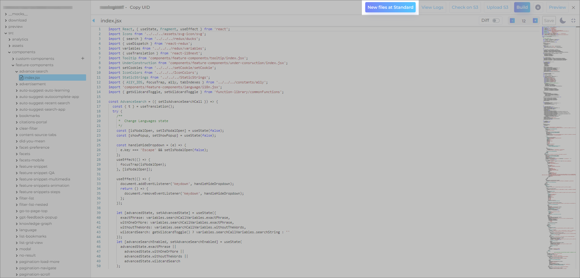 Fig: A snapshot highlighting the New Files at Standard button in React-based Search Client Editor.
