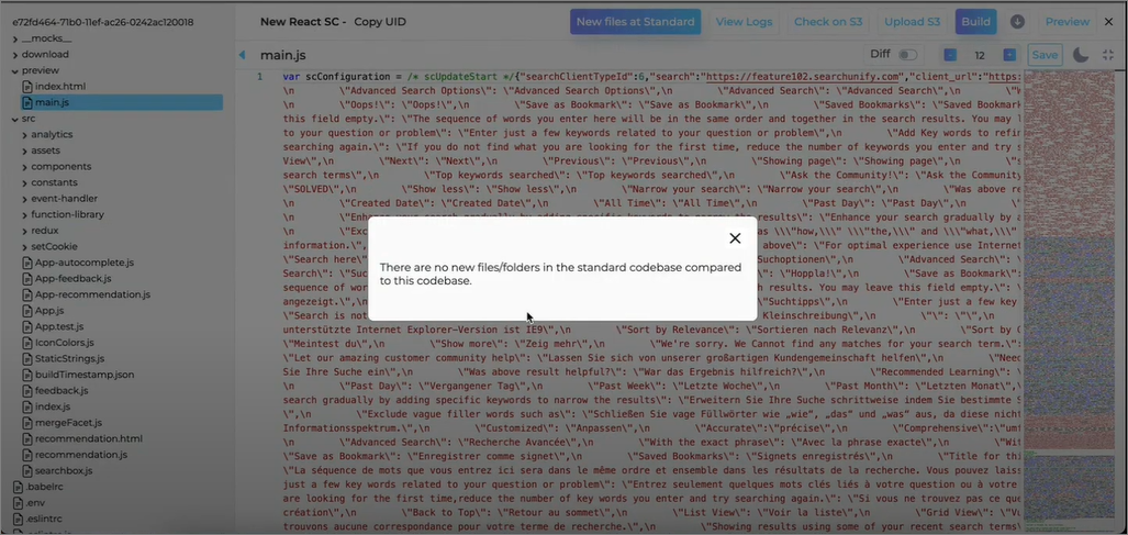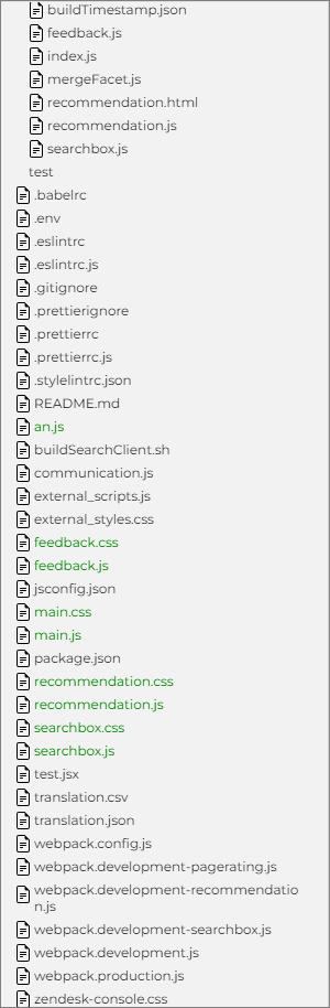 While you can view every file and folder related to your search client here, there are some files that are best left unchanged. Specifically, certain build files such as Main.js, App.js, Feedback.js, recommendations.js, and searchbox.js are generated at runtime. Therefore, it is recommended not to modify any files outside of the Src repository.