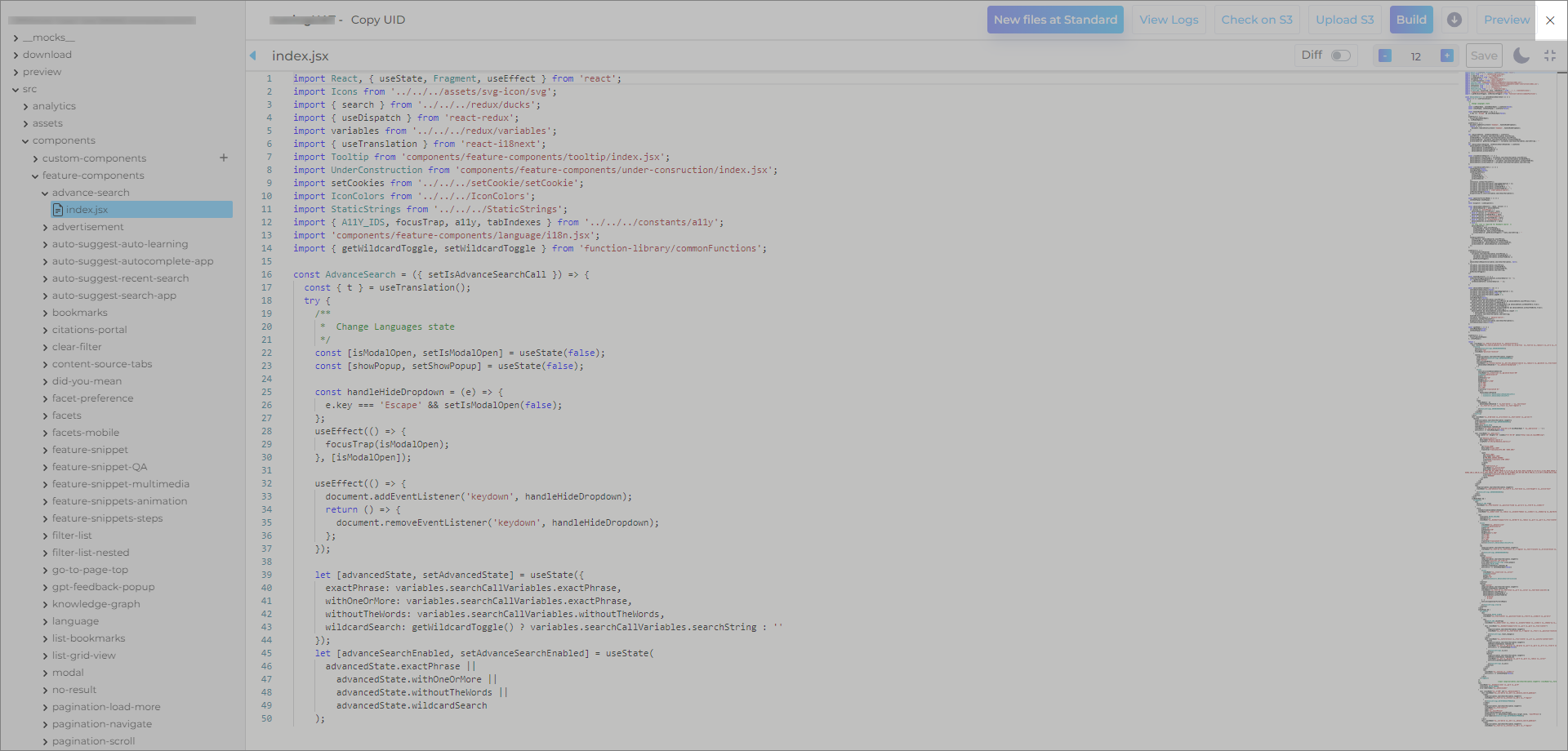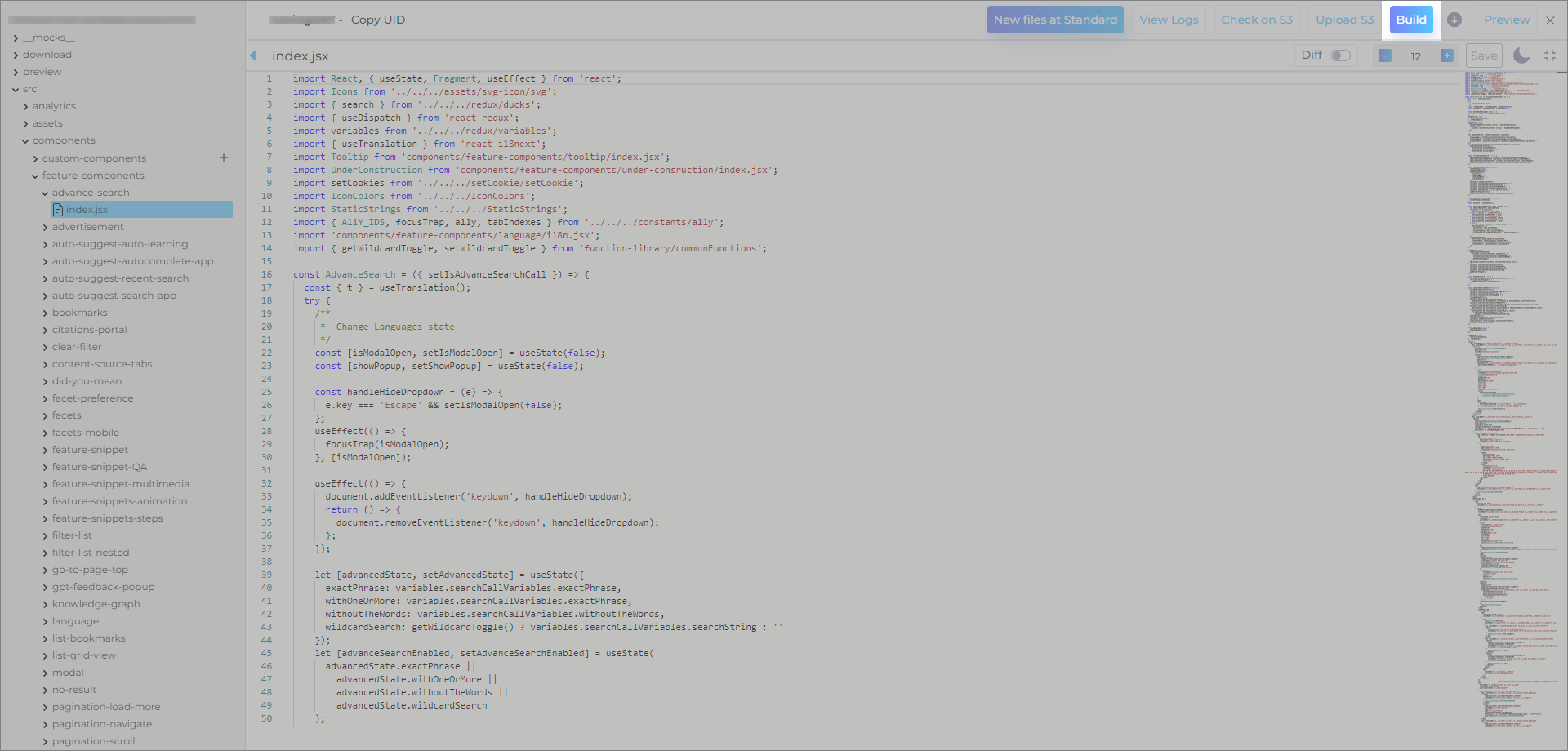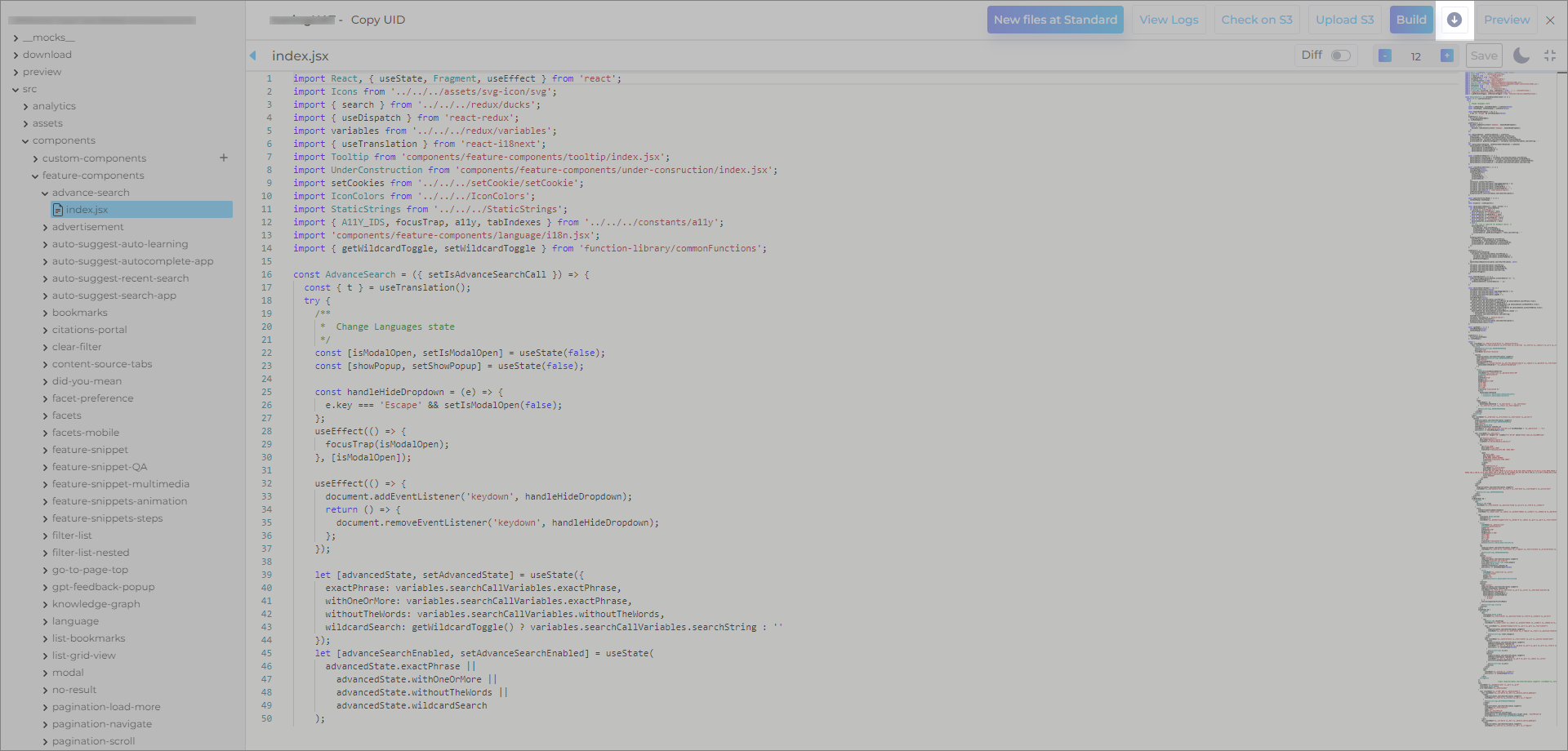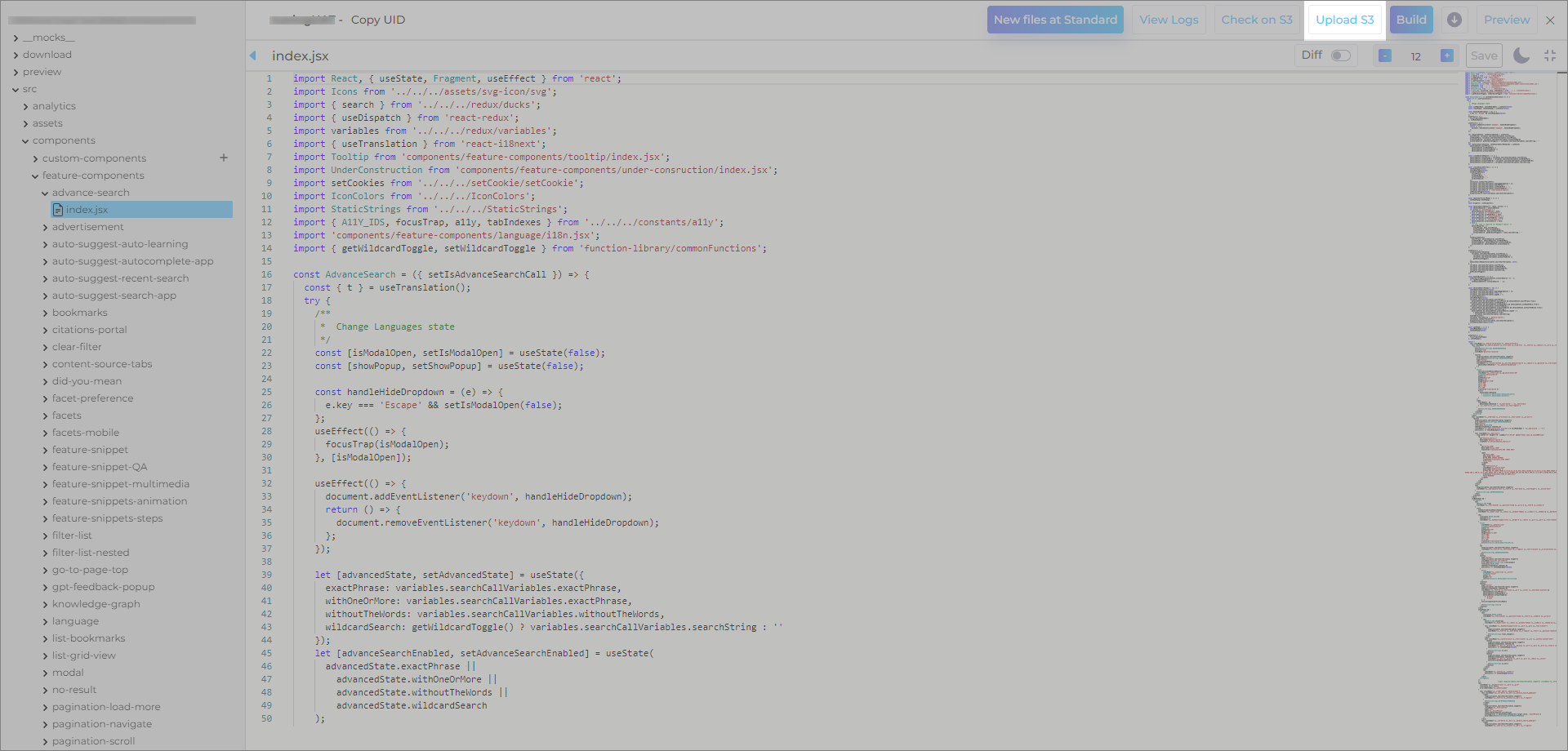 Fig: A snapshot highlighting the Upload S3 button in React-based Search Client Editor.