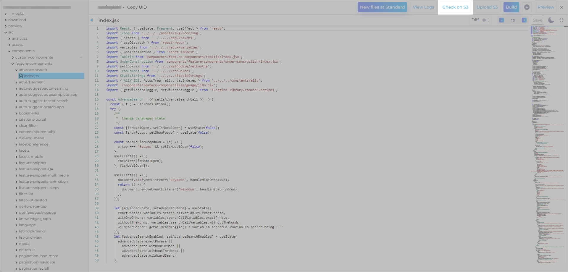 Fig: A snapshot highlighting the Check on S3 button in React-based Search Client Editor.