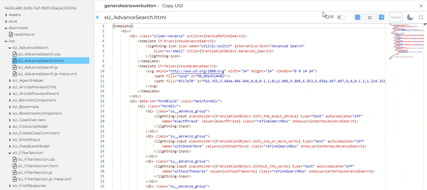 Features that are common in the Salesforce-based and React-based search clients, including Hide. Zoom In/Zoom Out, Diff Editor, Save, Night Mode, and Fullscreen. All these features have been explained in the previous sections.