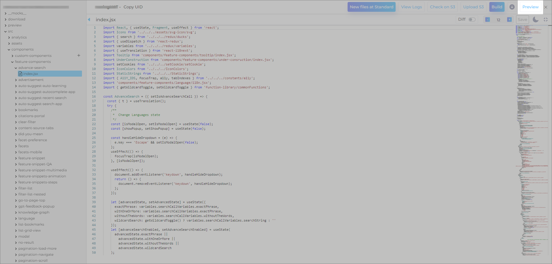 Fig: A snapshot highlighting the Preview button in React-based Search Client Editor.