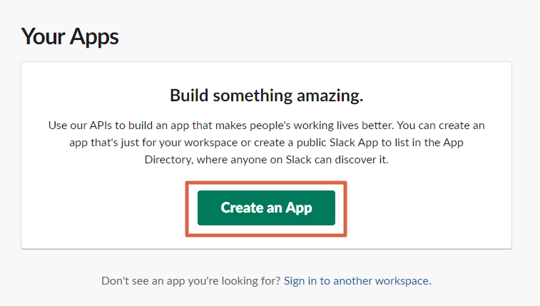 - Go to https://api.slack.com/apps and click Create an App.