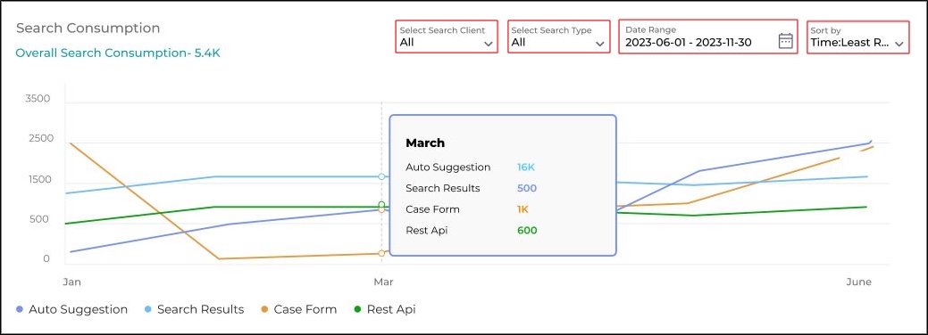 The Search Consumption graph shows the contribution of each Search Client to overall search usage. It provides detailed insights into the usage patterns of various Search Clients. This graph tracks the usage of different search types, including: