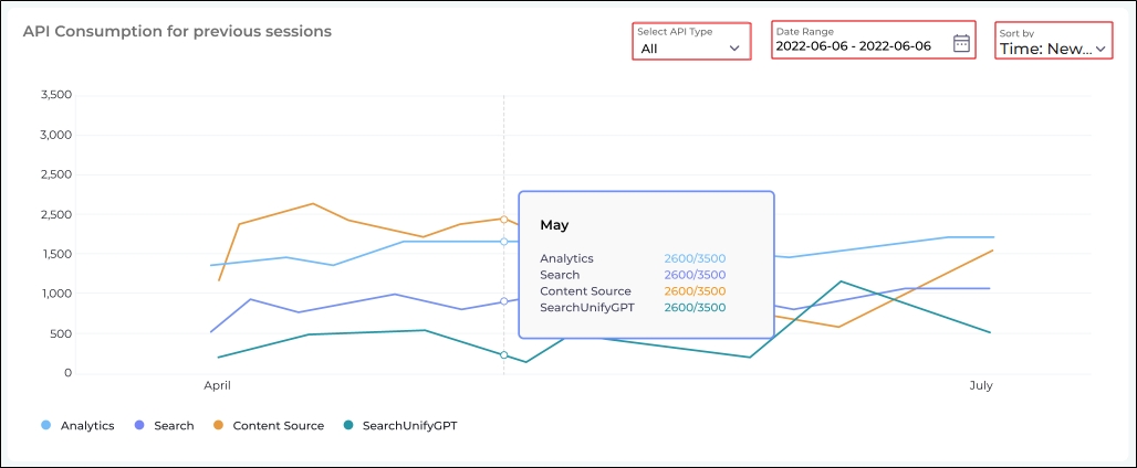 The Select API Type option allows you to filter the data by API, and the Sort By dropdown lets you view consumption in two ways: