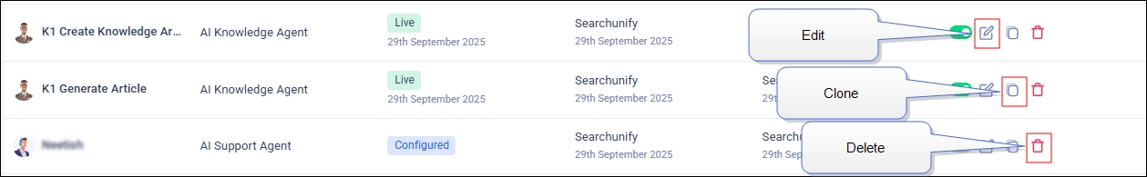 You can always edit, clone, and delete an agent using the Edit, Clone, and Delete buttons.
