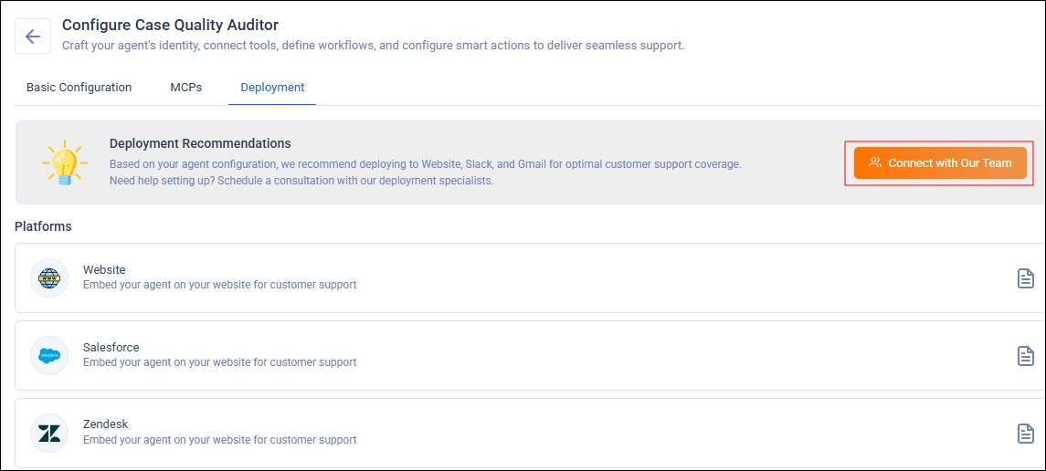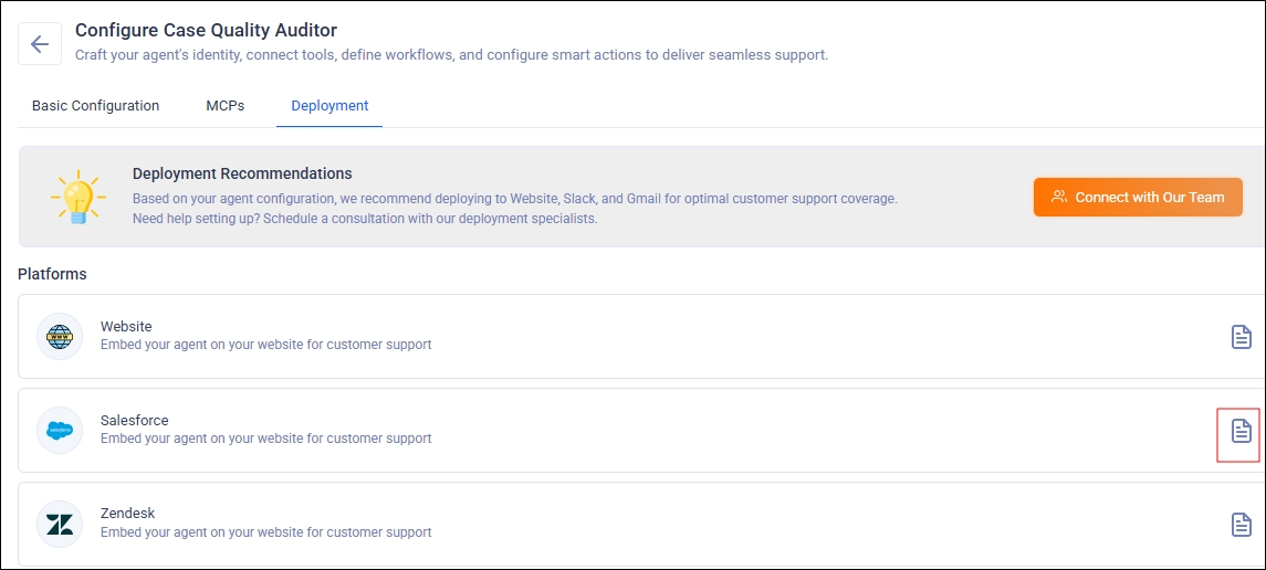 If you’re installing the Case Quality Auditor Agent in Salesforce yourself, click the document icon to view the deployment instructions.