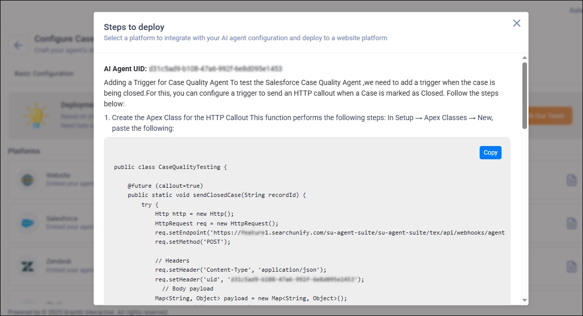 Until now, you have configured the Case Quality Auditor in the Agentic Suite. In this section, you will learn how to install the configured agent on Salesforce. You can either perform the installation yourself or get assistance from the SearchUnify team.