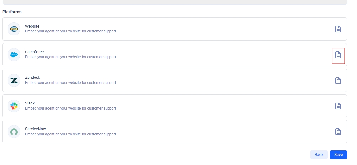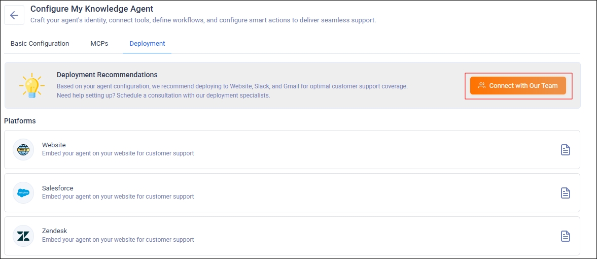 If you’re installing the Knowledge Agent in Salesforce yourself, click the document icon to view the deployment instructions.