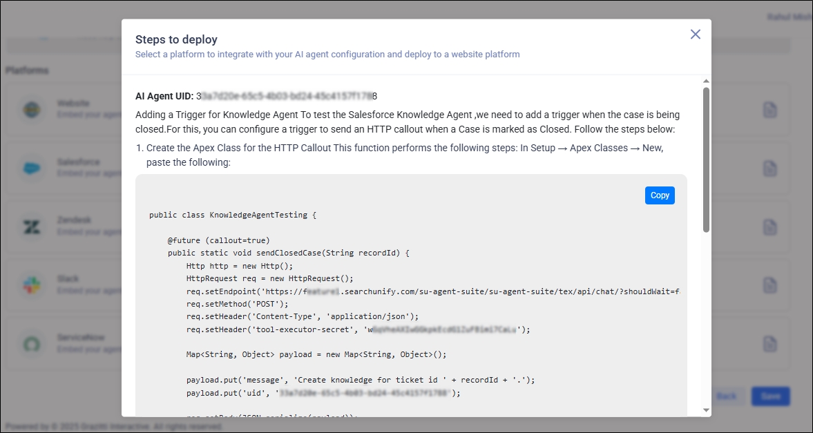Until now, you have configured the Knowledge Agent in the Agentic Suite. In this section, you will learn how to install the configured agent on Salesforce. You can either perform the installation yourself or get assistance from the SearchUnify team.