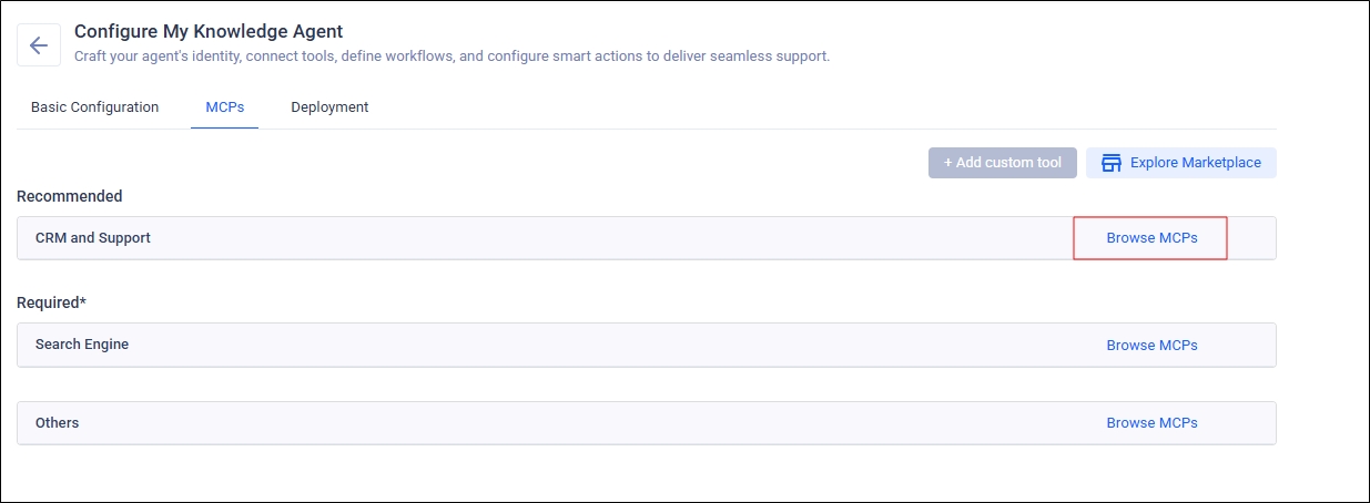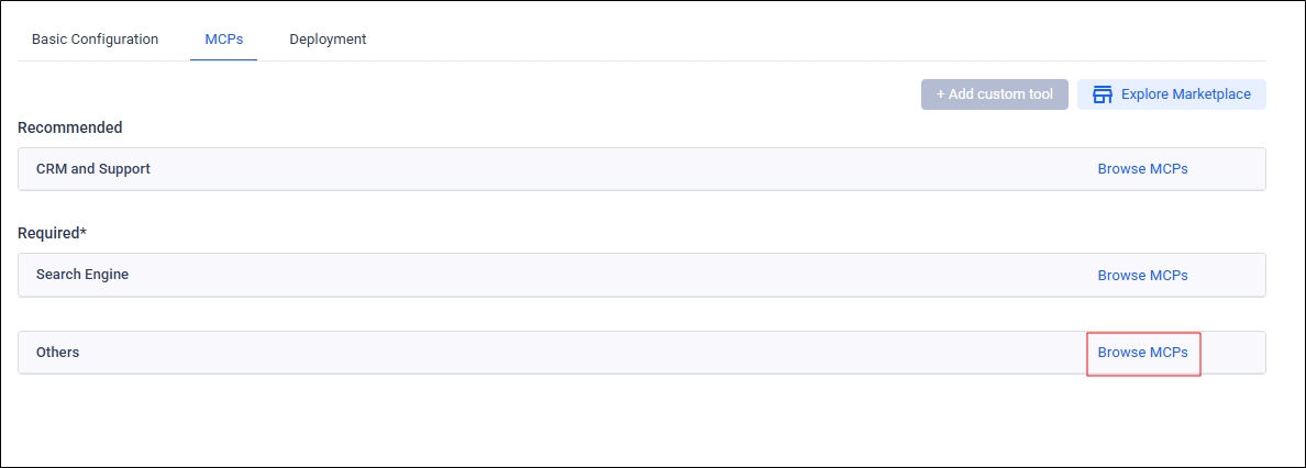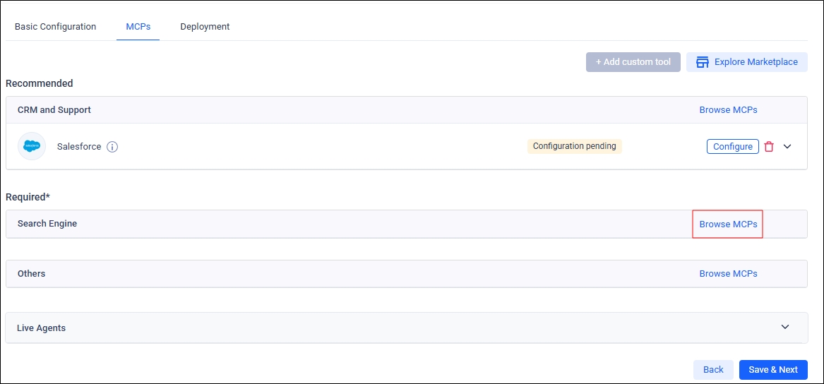 MCPs are specialized apps required for your agent to function properly. The MCP that is absolutely required is the search client in the Required section. The MCPs in the other sections–Recommended, Others and Live Agents–are optional. This document covers each section as it appears on the screen.