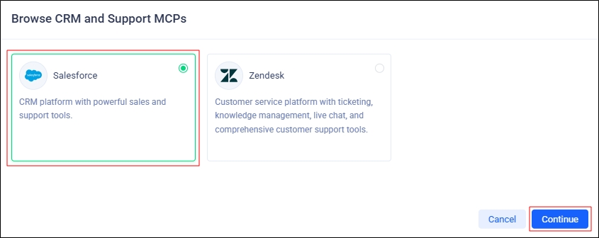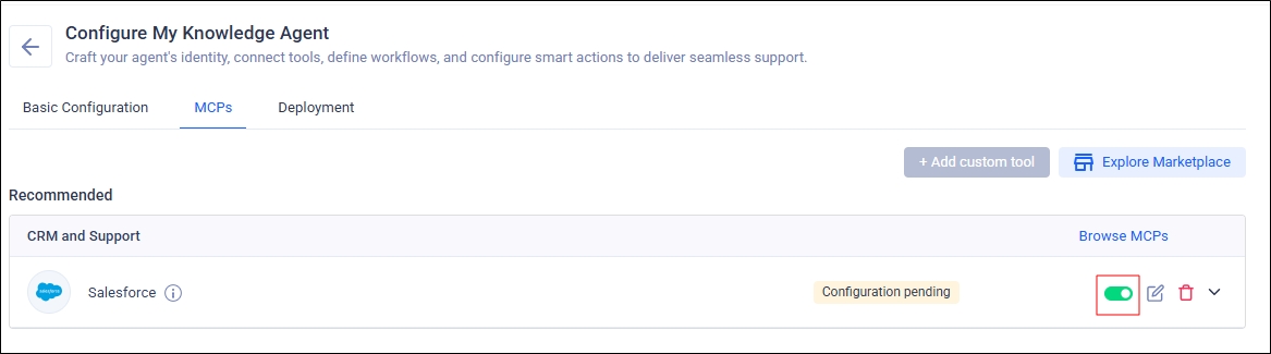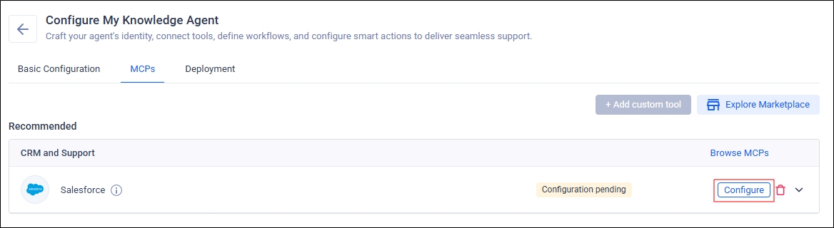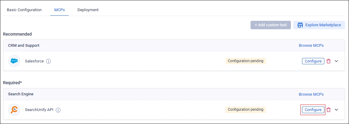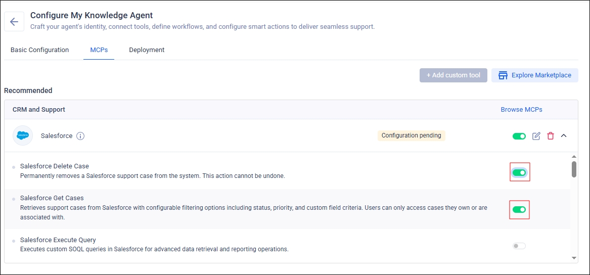 These are the MCPs that are essential for the agent to function. Currently, the only MCP supported in this section is the Salesforce search client.
