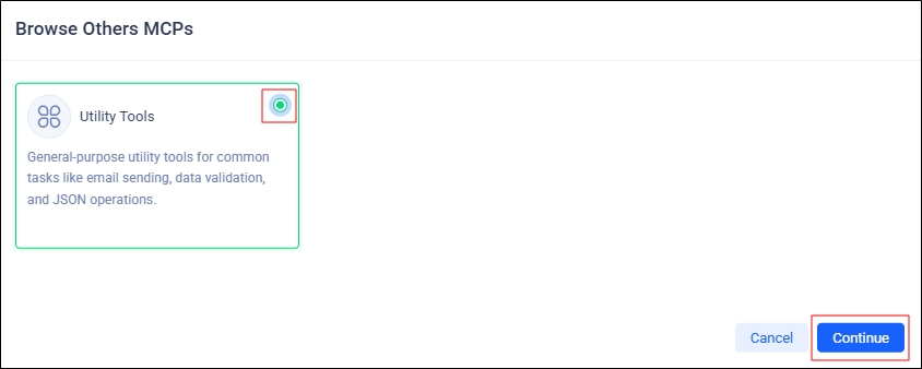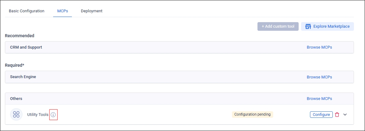 These MCPs provide SearchUnify-built features to the agent. You can view the complete list of features by clicking the information icon on Utility Tools.