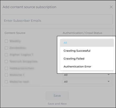 - In the Authentication/Crawl Status column, select a notification. The following options are available: