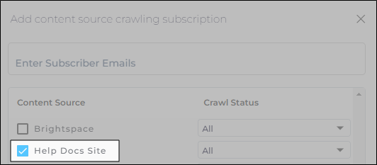 - To receive notifications for a content source, check it in the Content Source column on the left. Help Docs Site has been checked in the image.
