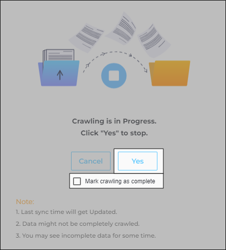 An email notification is triggered when an admin stops a crawl and does not check Mark Crawling as Complete.
