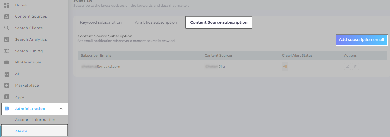 - Go to Administration > Alerts > Content Source Subscription. Click Add Subscription.
