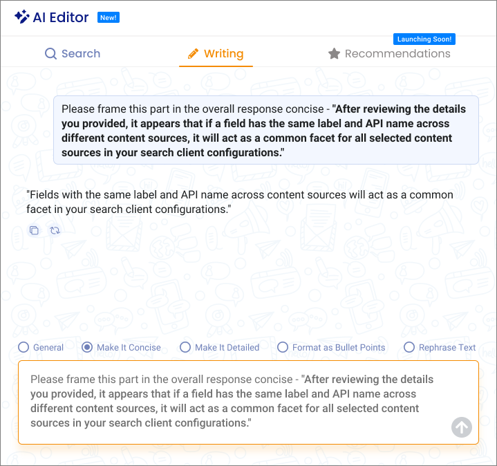 Also, you can use the standard formatting options to give a command to the LLM on what kind of response you want. The options include, General, Make it Concise, Make it Detailed, Format as Bullet Points, and Rephrase Text.