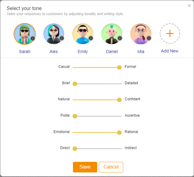 Agents can set the desired tone by selecting their ideal profile or create their own by setting the tone for their profile (e.g., formal or casual, direct or indirect, polite or assertive) and style (e.g., brief or detailed) for the response. The LLM will generate a text that matches these specifications. This ensures that the response aligns with the brand’s voice, the case's specific context, and the recipient's preferences.