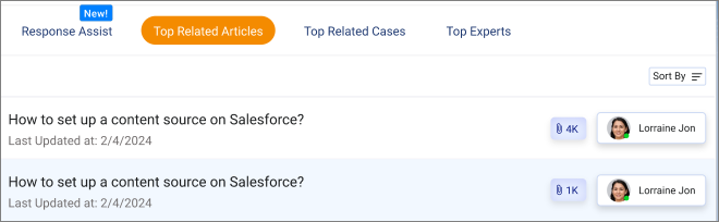 Fig: Snapshot shows the Top Related Articles screen in Agent Helper console