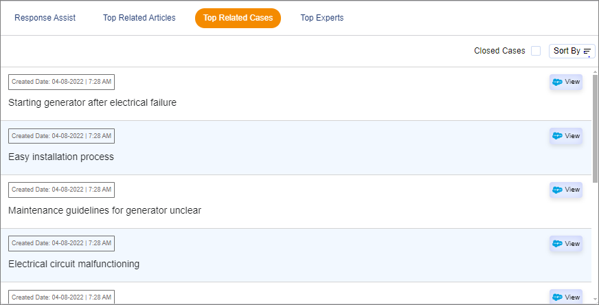 Use Sort By to filter cases by Case Creation date and Top Agents. In the default state, the cases are listed by relevancy. The most similar cases are presented first. Click the View button to open the case in a new Salesforce tab.