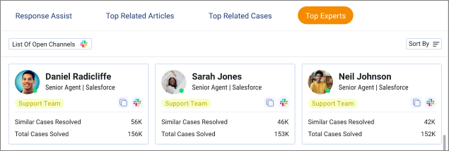 In this section, you can find the support agents who have worked on cases similar to yours. Each expert has a profile, role, team, and platform (Slack) listed.