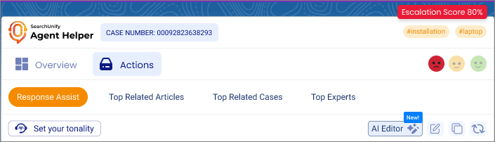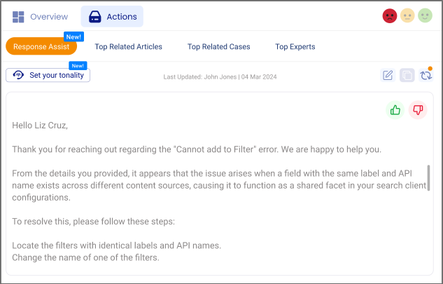 A thumbs up and thumbs down feedback feature is now available for the Response Assist section in the Actions tab.