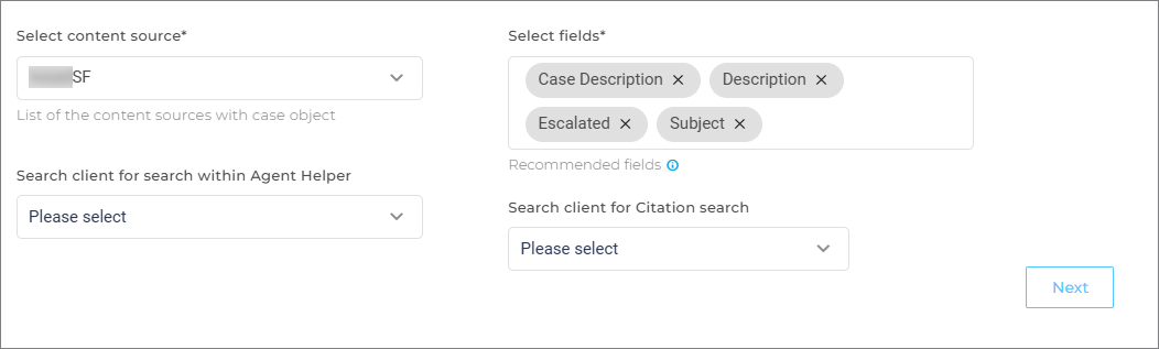 There are two additional fields – Search Client for Search within Agent Helper and Search Client for Citation Search – to select the search clients you want to use for "search" and "Citations". Both fields are optional and are useful if you want to use a different search client (other than the Salesforce search client you selected for Agent Helper) for retrieving search results and citations for SUGPT-generated responses.
