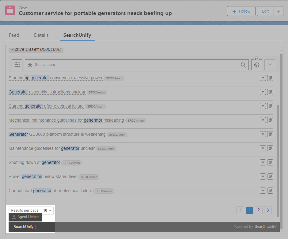 After installing the search client in Salesforce, click on the three dots icon on the SearchUnify element on your case details page and select Agent Helper.