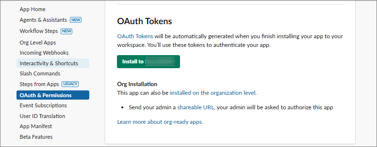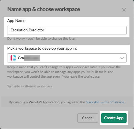 Enter a name for the app in the App Name field and select a Slack workspace from the dropdown Pick a workspace to develop your app in. Then click Create App.